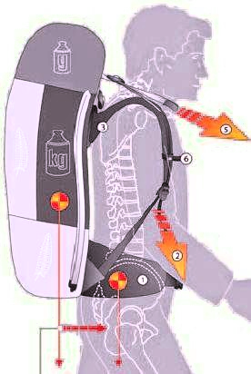 Si cargamos la mayor cantidad de peso en el fondo de la mochila éste realizaría palanca sobre el cuerpo cargando de los hombros lo que haría que nos tirara el cuerpo hacia atrás. Si quisiéramos reequilibrar el cuerpo deberíamos echar el cuerpo muy hacia delante. Cuando el terreno no tiene dificultad podemos subir la carga un poco más en nuestra mochila, siempre pegado a su espalda, de esta manera, al estar la mayor cantidad de peso justo sobre la vertical de nuestro centro de gravedad nos ayudaría a tener una posición más erguida y natural.